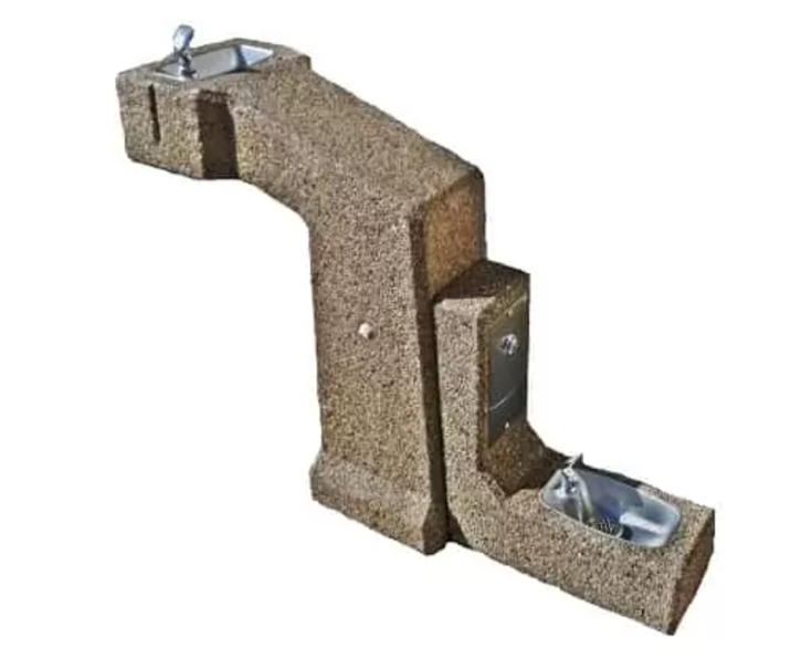 Vandalskyddad hög/låg dricksfontän för fristående markmontage utomhus.